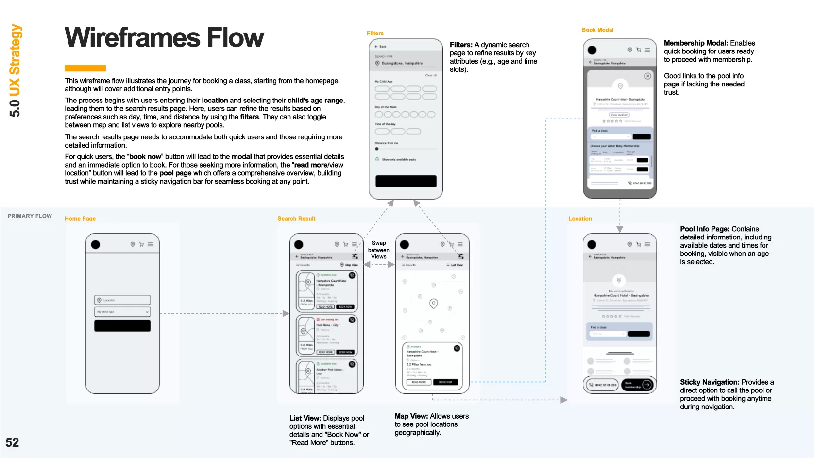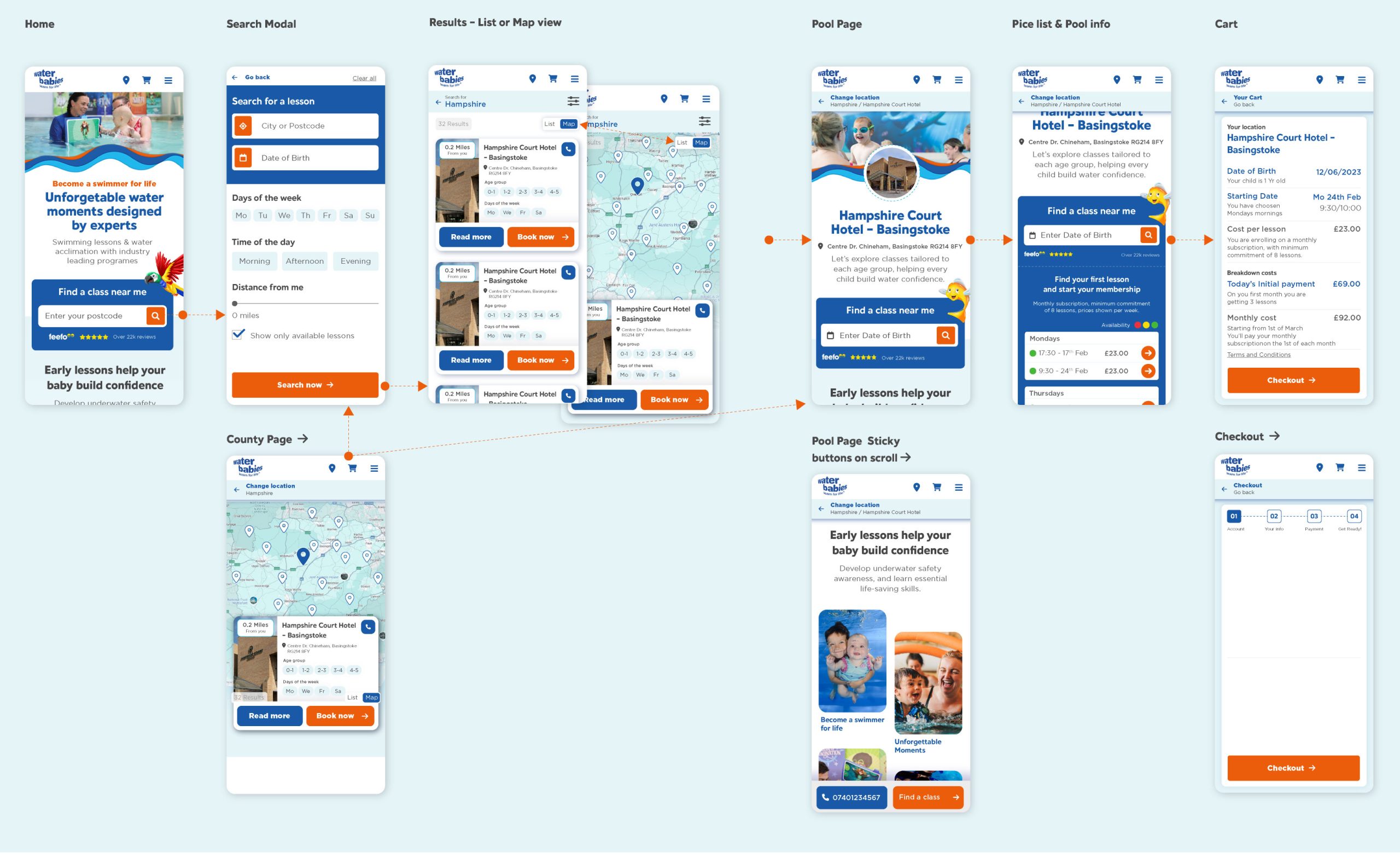 - Wireframes and flows – Produced detailed wireframes for search, location results, pool pages, and checkout, ensuring consistency and ease of navigation across the full user journey.